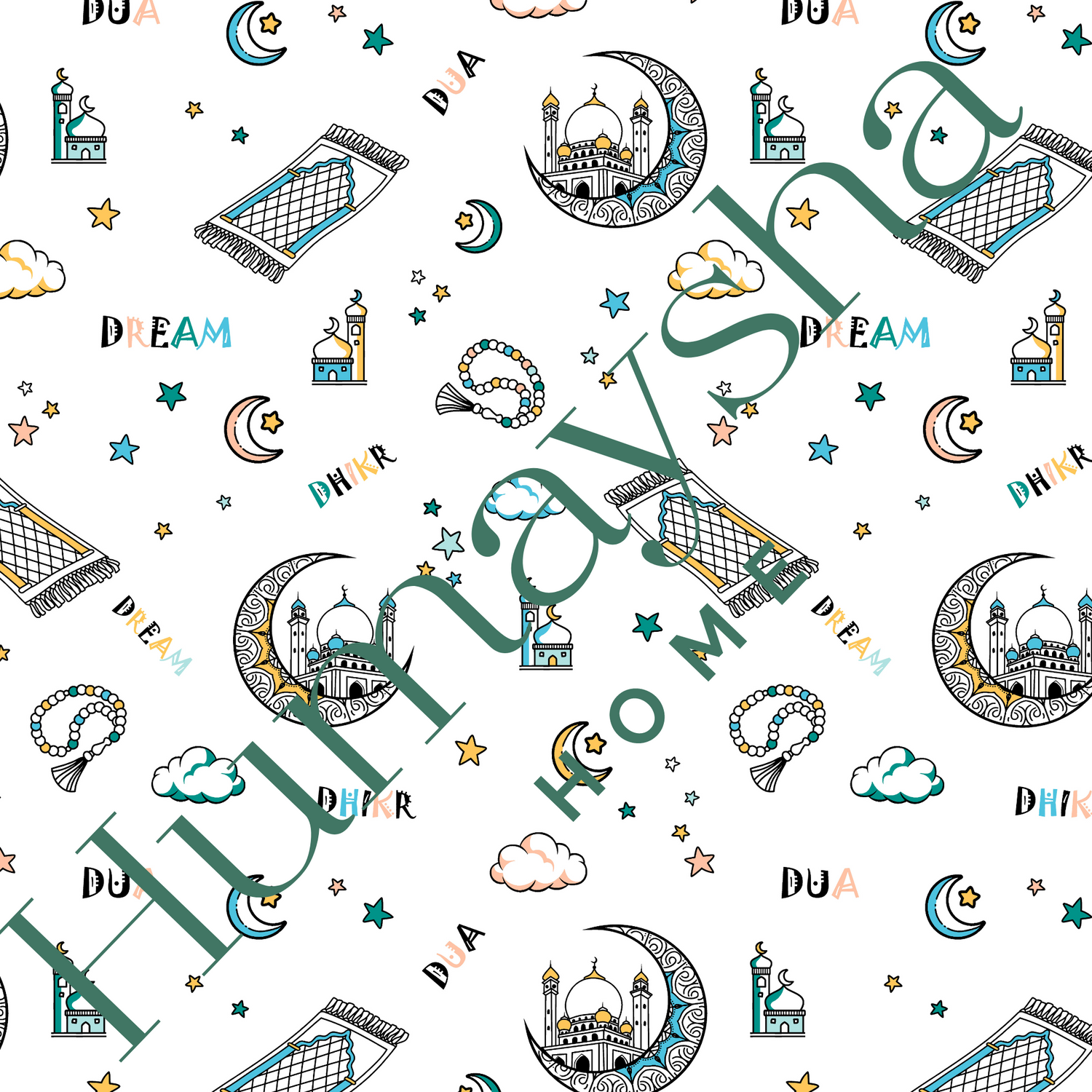 Designed with utmost comfort and convenience in mind. Adorned with graphics of mosques, prayer beads, prayer mats, and the nighttime sky, these pajamas embody the essence of dua, dhikr, and dreaming.
